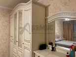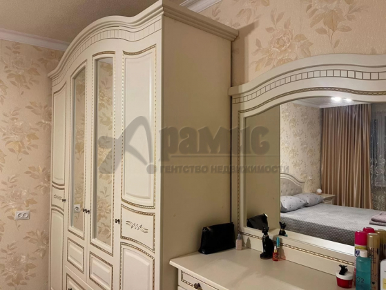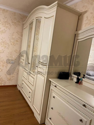 В комнате установлен вместительный шкаф с зеркалом и кроватью, создающие комфортное пространство для сна.